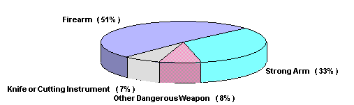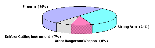 | | | | | | | | | | | | | | | | | | | | | | | | | | | | | | Type of Weapon | 2011 | % Distribution | 2012 | % Distribution | % Change | | Firearm | 4,768 | 50.4 % | 4,786 | 51.5 % | 0.4 % | | Knife or Cutting Instrument | 667 | 7.1 % | 675 | 7.3 % | 1.2 % | | Other Dangerous Weapon | 852 | 9.0 % | 747 | 8.0 % | -12.3 % | | Strong Arm | 3,169 | 33.5 % | 3,094 | 33.3 % | -2.4 % | | Total | 9,456 | 100.0 % | 9,302 | 100.0 % | -1.6 % |