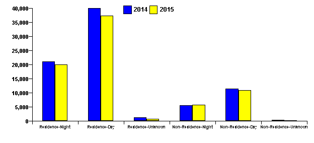 | | | | | | | | | | | | | | | | | | | | | | | | | | | | | | | | Premise | 2014 | % Distribution | 2015 | % Distribution | | Residence-Night | 21,090 | 26.6 % | 19,879 | 26.7 % | | Residence-Day | 39,870 | 50.3 % | 37,285 | 50.1 % | | Residence-Unknown | 1,165 | 1.5 % | 663 | 0.9 % | | Non-Residence-Night | 5,509 | 7.0 % | 5,612 | 7.5 % | | Non-Residence-Day | 11,375 | 14.4 % | 10,832 | 14.5 % | | Non-Residence-Unknown | 253 | 0.3 % | 190 | 0.3 % | | Total | 79,262 | 100.0 % | 74,461 | 100.0 % |