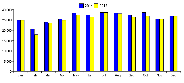 | | | | | | | | | | | | | | | | | | | | | | | | | | | | | | | | | | | | | | | | | | | | | | | | | | | | | | | | | | | | | | | | | | | | | | | | | | | | | | | | | | | | | | | | | | | | | | | | | | | | | | | | | | | | | | | | | | | | | | | | | | | | | | | | | | | | | | | | | | Year | Jan | Feb | Mar | Apr | May | Jun | Jul | Aug | Sep | Oct | Nov | Dec | Total | | 2014 | 24,855 | 20,504 | 23,879 | 25,498 | 28,422 | 27,546 | 28,715 | 28,423 | 27,573 | 28,692 | 25,417 | 26,964 | 316,488 | | 2015 | 24,911 | 17,871 | 23,489 | 24,875 | 27,385 | 26,615 | 28,599 | 28,099 | 26,473 | 26,980 | 25,632 | 26,805 | 307,734 | | Percent Change | 0.2 % | -12.8 % | -1.6 % | -2.4 % | -3.6 % | -3.4 % | -0.4 % | -1.1 % | -4.0 % | -6.0 % | 0.8 % | -0.6 % | -2.8 % |